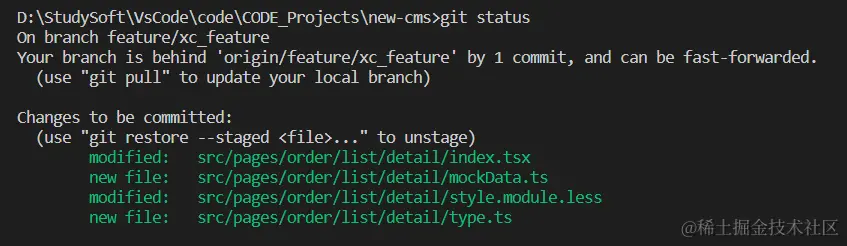 回退版本后可以执行git status命令来查看当前项目的状态,它可以显示哪些文件已修改,哪些文件已暂存,哪些文件未被 Git 跟踪,以及当前分支的状态等信息。: