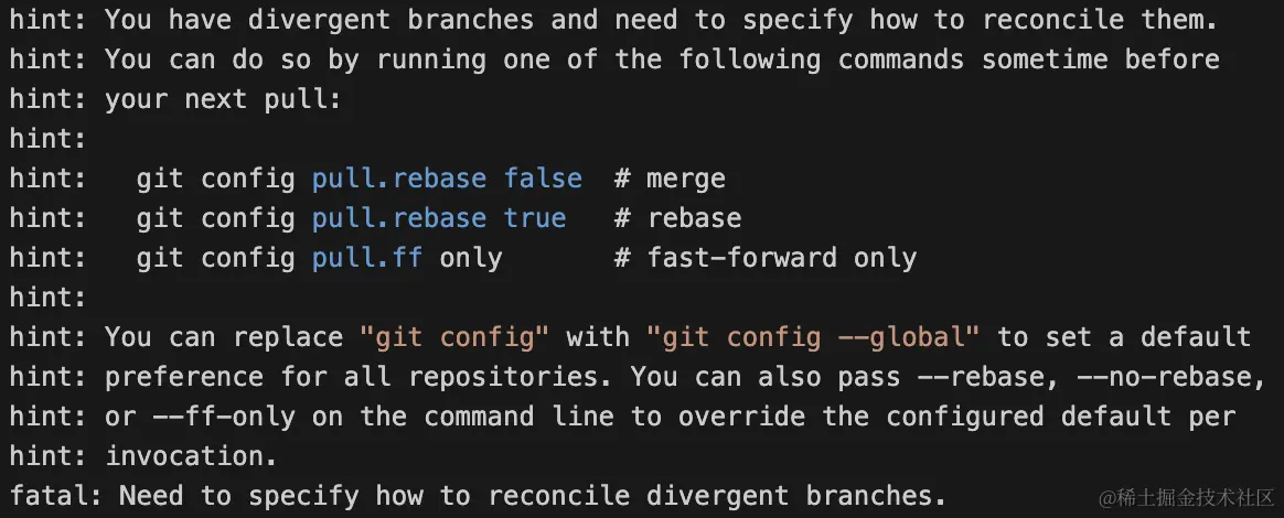 - 原因: 将本地分支推送到远程分支时,本地分支和远程分支存在冲突,需要指定如何合并它们。