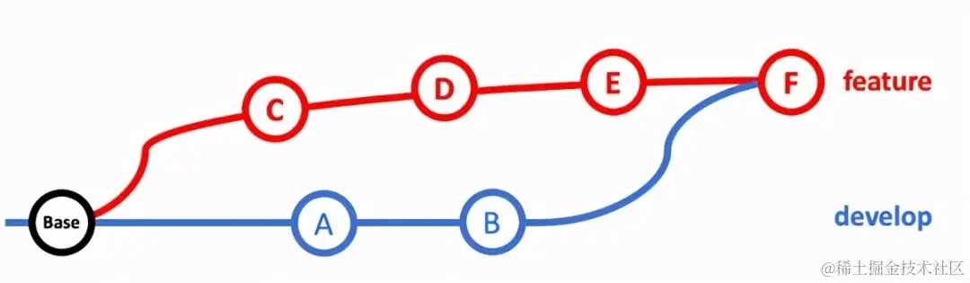merge合并将在您的特征分支中将更改集成,并创建一个新的提交F。F是合并开发分支的提交,如果有冲突的话,对冲突进行修改。此方法将为特征分支带来Develp分支的更改,即A和B。现在,您的特征分支上的提交是C,A,D,B,E,F。有3个添加到您的功能分支中的其他提交。
