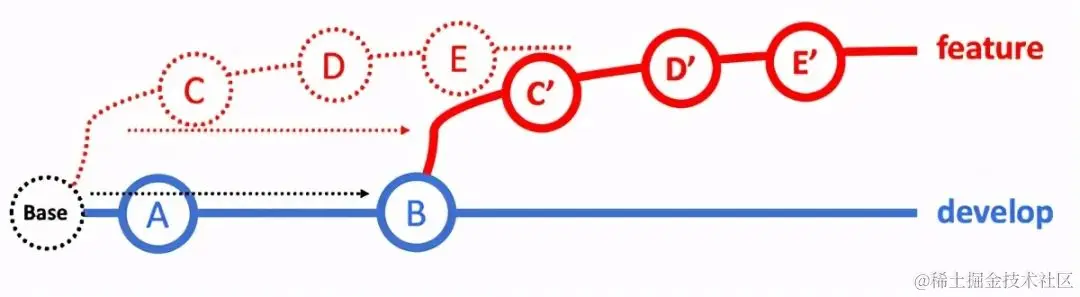 rebase变基会移动整个功能分支,就像它从一开始就从开发分支的最新提交分支出来一样。rebase将首先搜索功能分支的基础,然后将其更改为开发分支B上的最新提交,然后根据该基础B将所有提交重新应用到功能分支上。rebase实际上是创建新提交C’,D’,E’,原始提交保持不变。最后,它将要素分支指向的要素从E更改为E’。