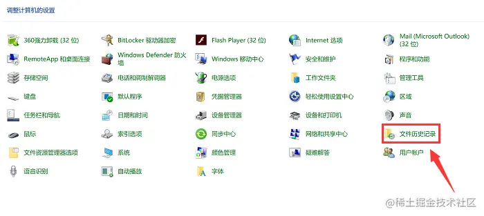 步骤2:在控制面板中找到 【历史文件记录】 ;
