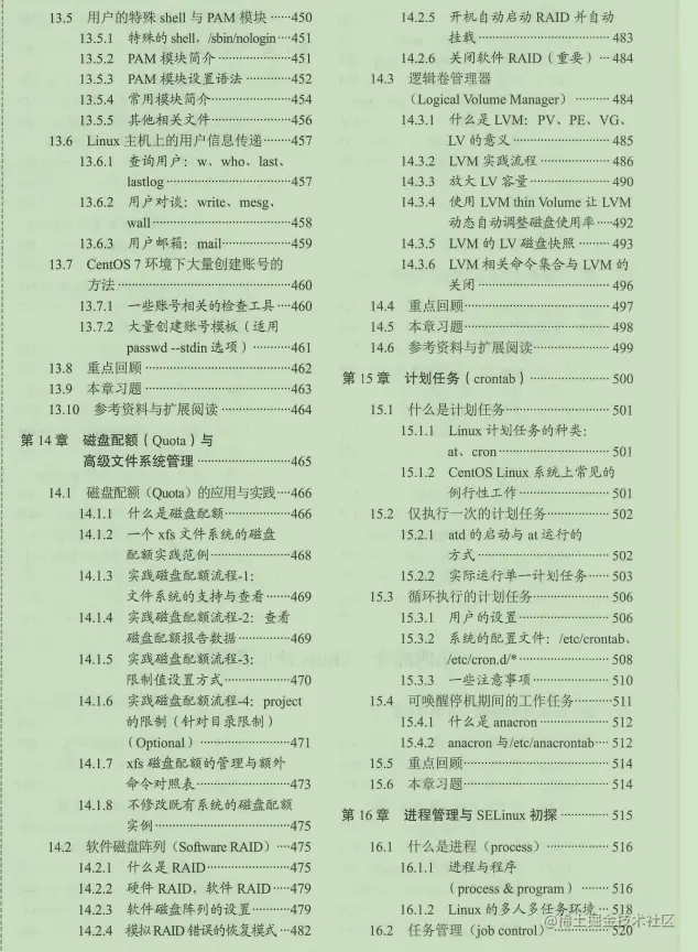 介绍了对于系统安全非常重要的Linux账号的管理、磁盘配额、高级文件系统管理、计划任务以及进程管理;