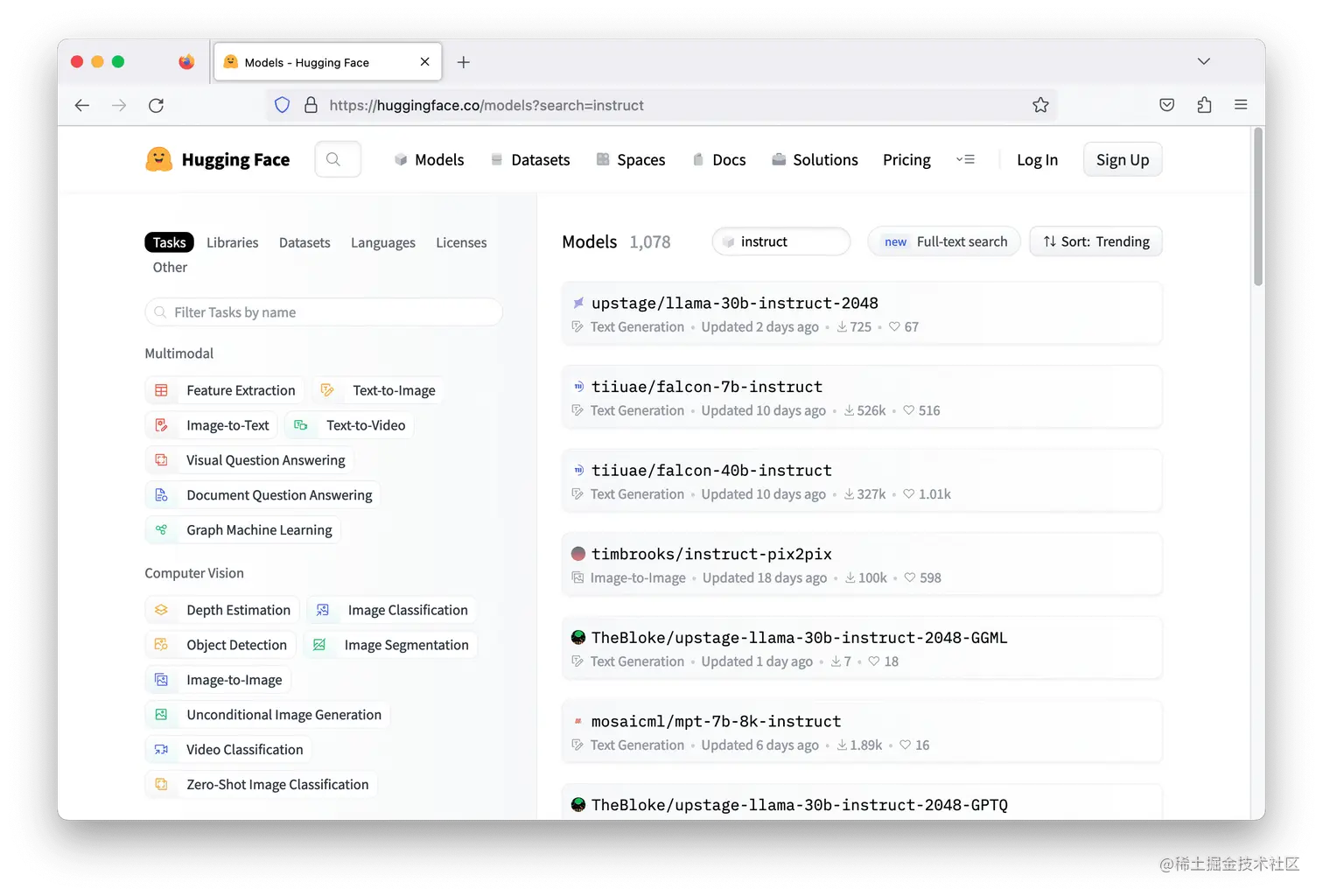 通常,模型后面的指令在模型名称中带有关键字“instruct”。在拥抱脸上使用此关键字搜索可以为您提供一千多个模型。但并非所有人都能奏效。您需要检查它们中的每一个并阅读它们的模型卡,以了解该模型可以做什么,以便选择最合适的模型。