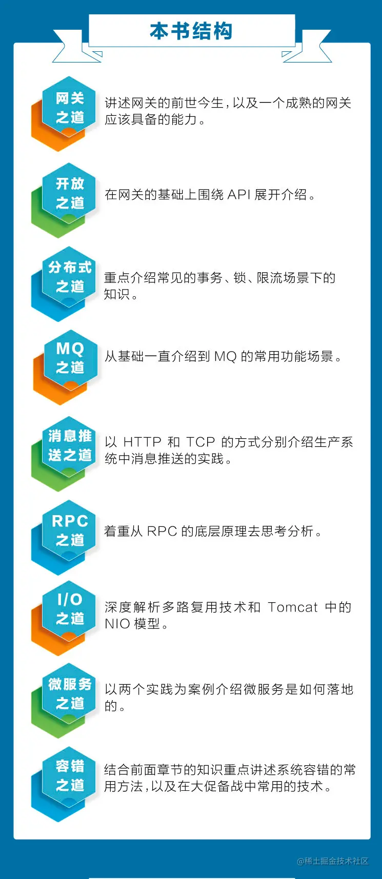 - 为我们介绍了软件架构设计中的典型场景,其中包含开放平台、分布式、微服务、服务容错、消息中间件等,相信大家看完这本书后,在系统架构设计方面会有所提升。