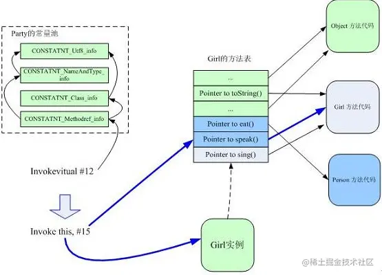 设该调用代码对应着 girl.speak(); #12 是 Party 类的常量池的索引。JVM 执行该调用指令的过程如下所示: