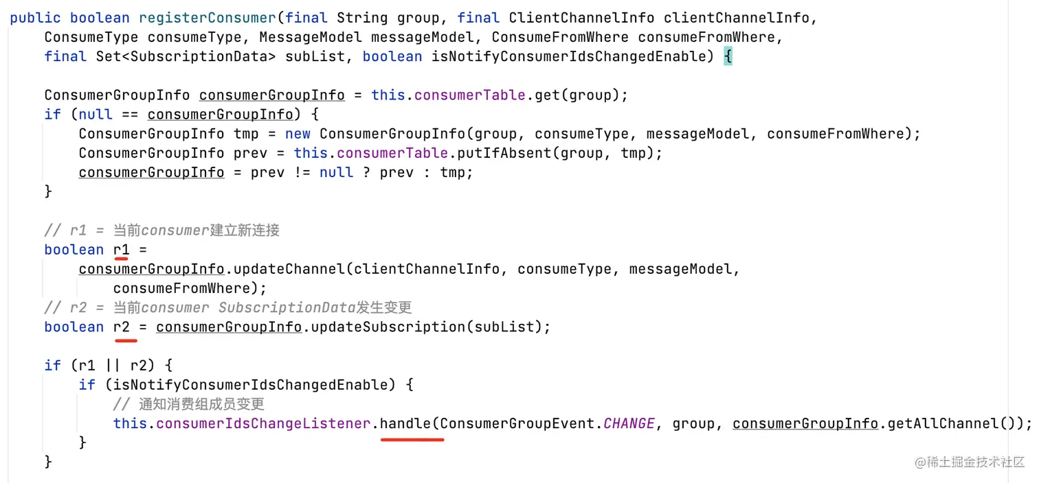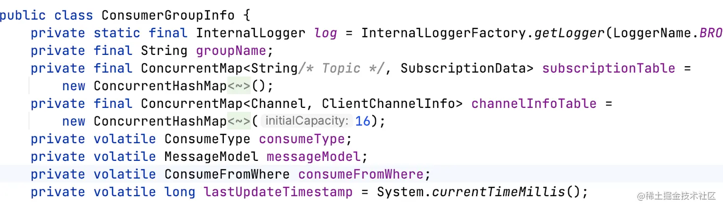 ConsumerGroupInfo=一个消费组信息=多个消费者实例心跳=多个ClientChannelInfo+订阅信息;