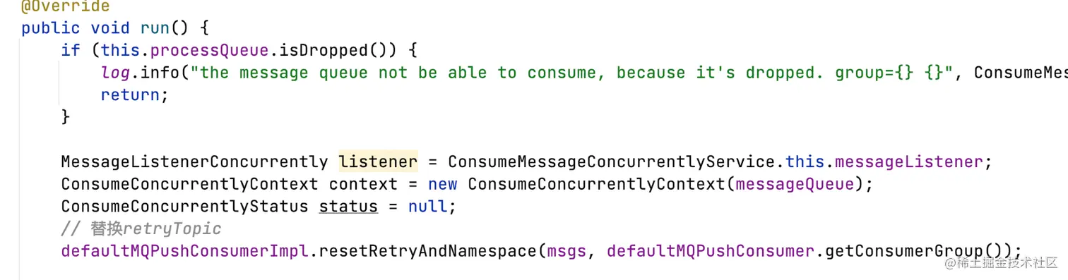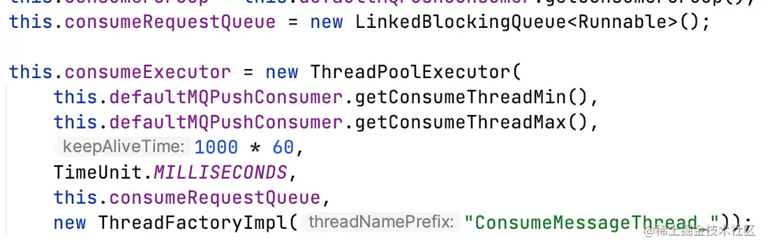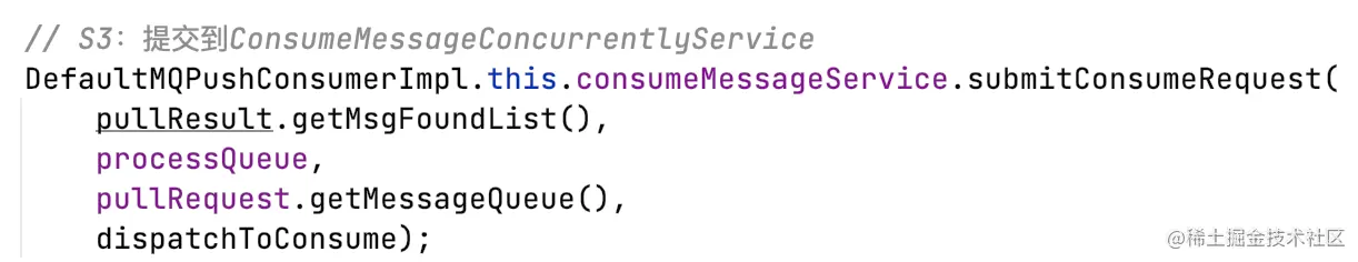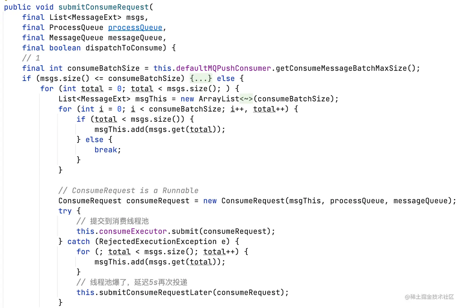 - 将消息分批提交到ConsumeMessageConcurrentlyService的线程池,默认1条消息一批对应一个ConsumeRequest(Runnable,ConsumeMessageConcurrentlyService的内部类);