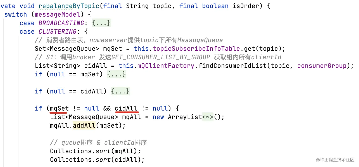 - 获取topic下所有MessageQueue和组内成员clientId集合;