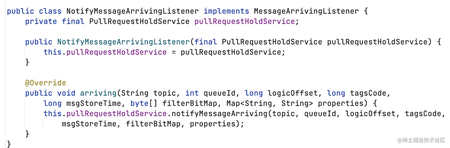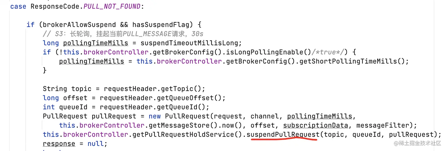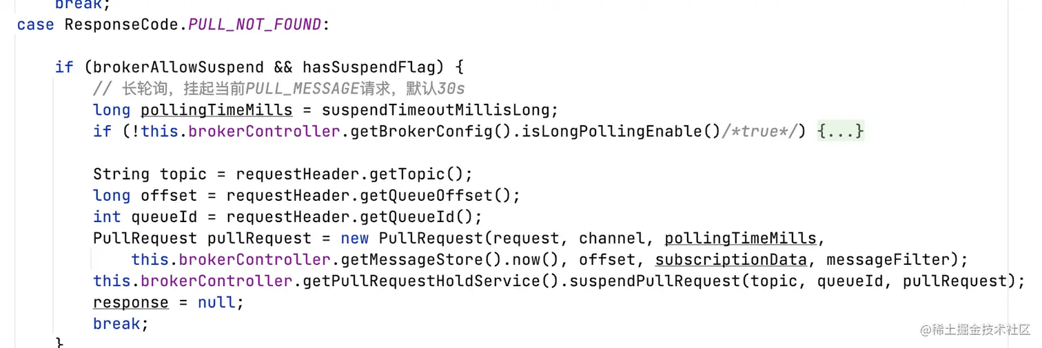 如果不存在消息,则挂起Pull请求,缓存到PullRequestHoldService,当超时30s或有新消息到达,获取消息响应客户端。