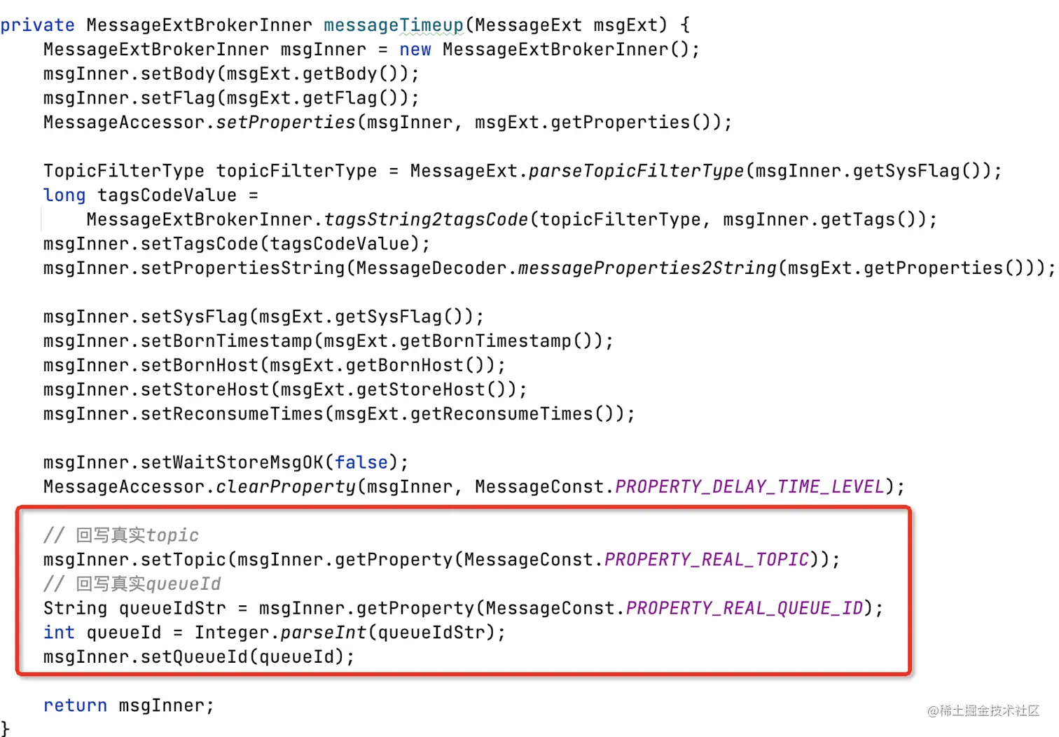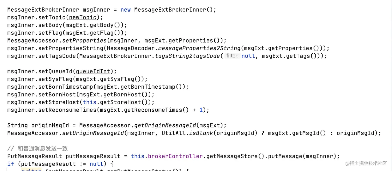 将properties.REAL_TOPIC和properties.REAL_QID回写到message,重新投递到commitlog,进而构建consumequeue对消费者可见。