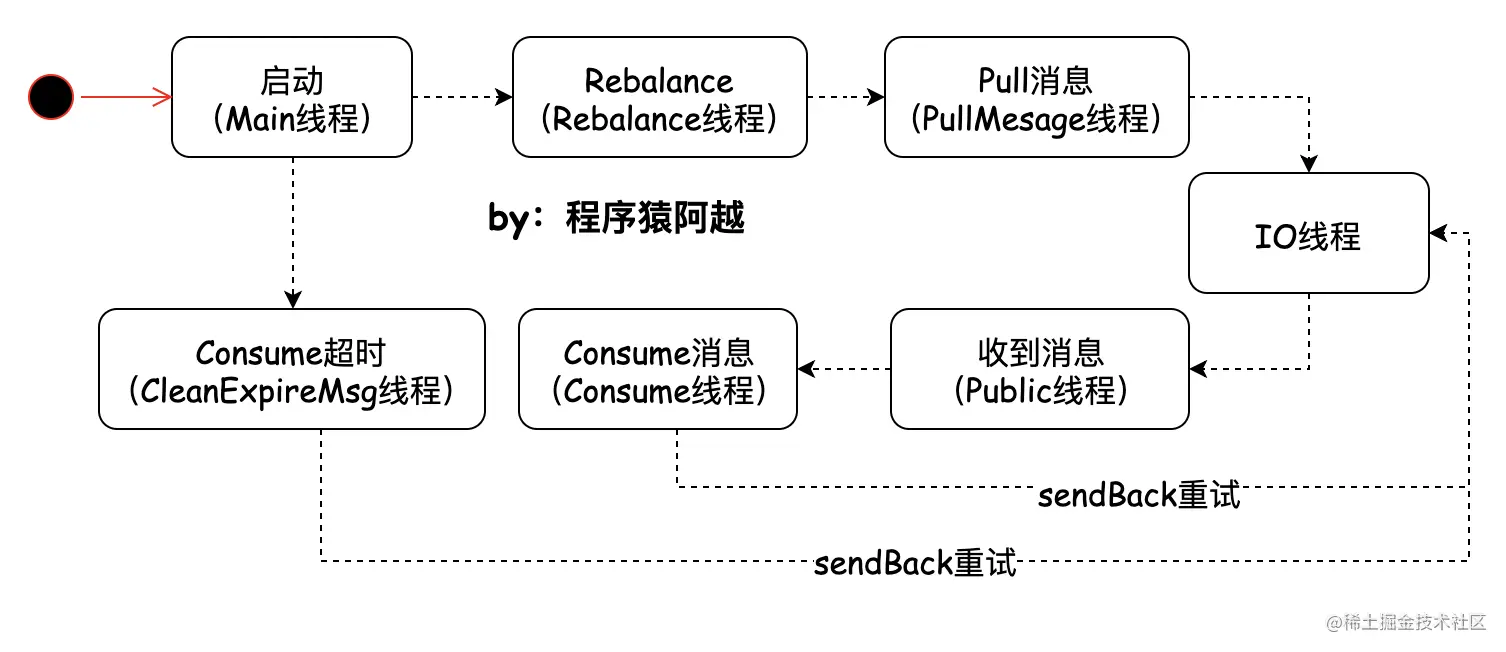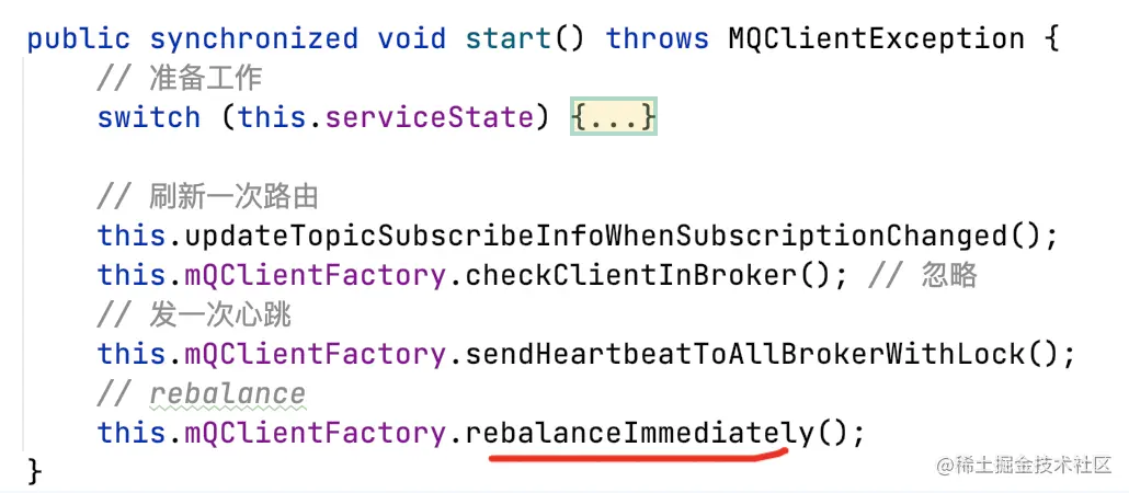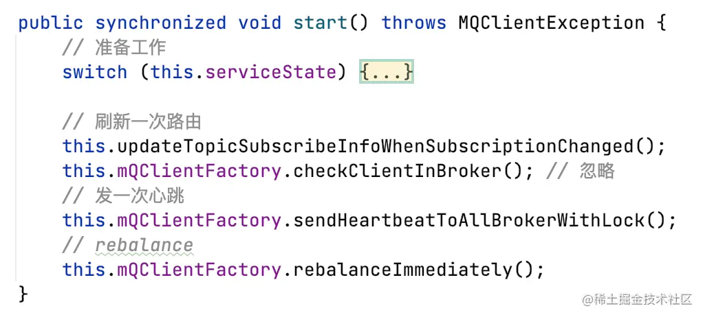 - MQClientInstance启动,包括:通讯client、心跳任务、路由刷新任务、定时持久化offset任务(5s)、Pull消息线程、Rebalance线程;