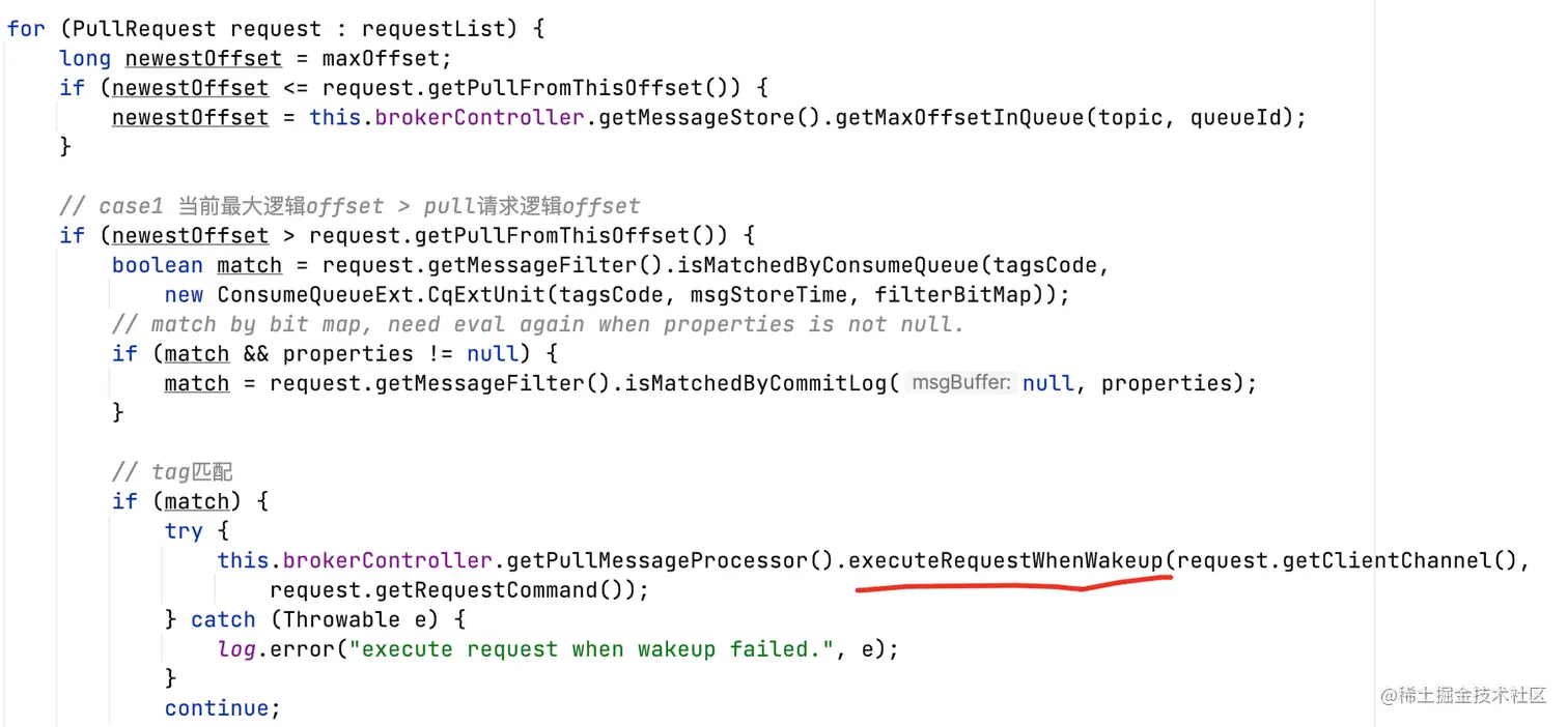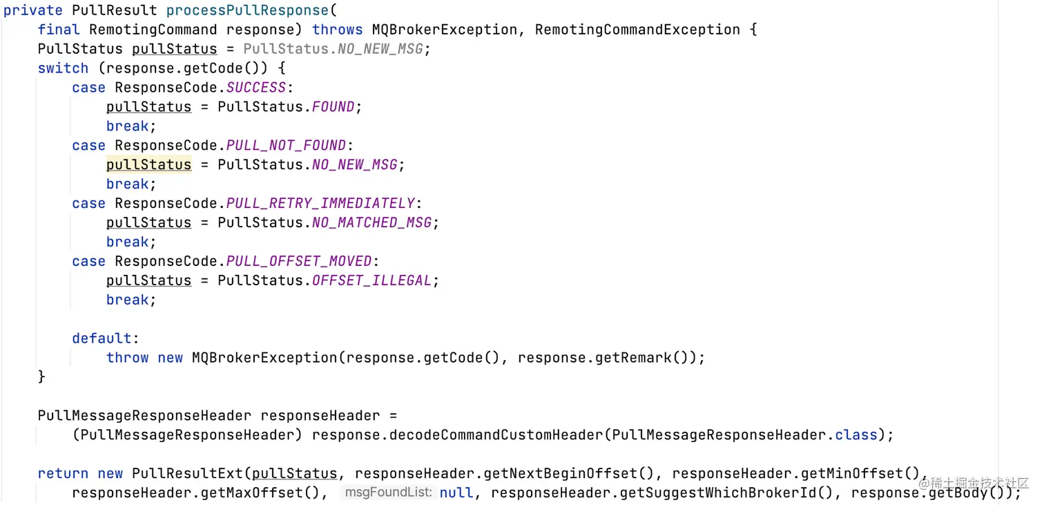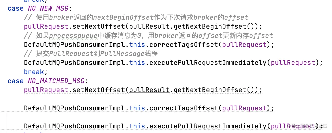 - NO_NEW_MSG/NO_MATCHED_MSG,如果queue中没有更多消息,再次提交PullRequest到PullMessageService线程;
