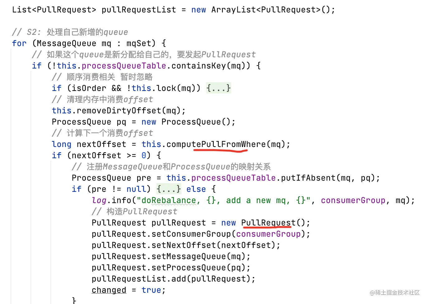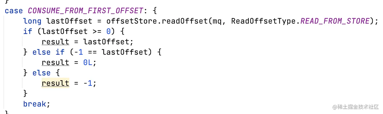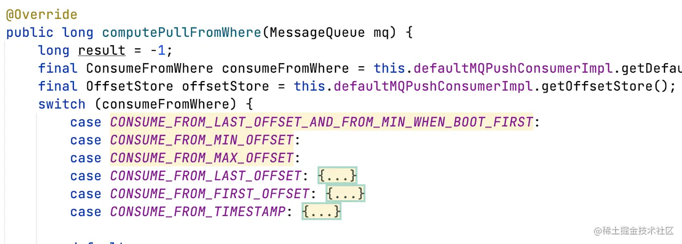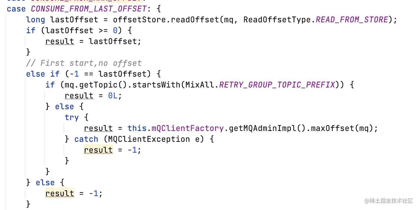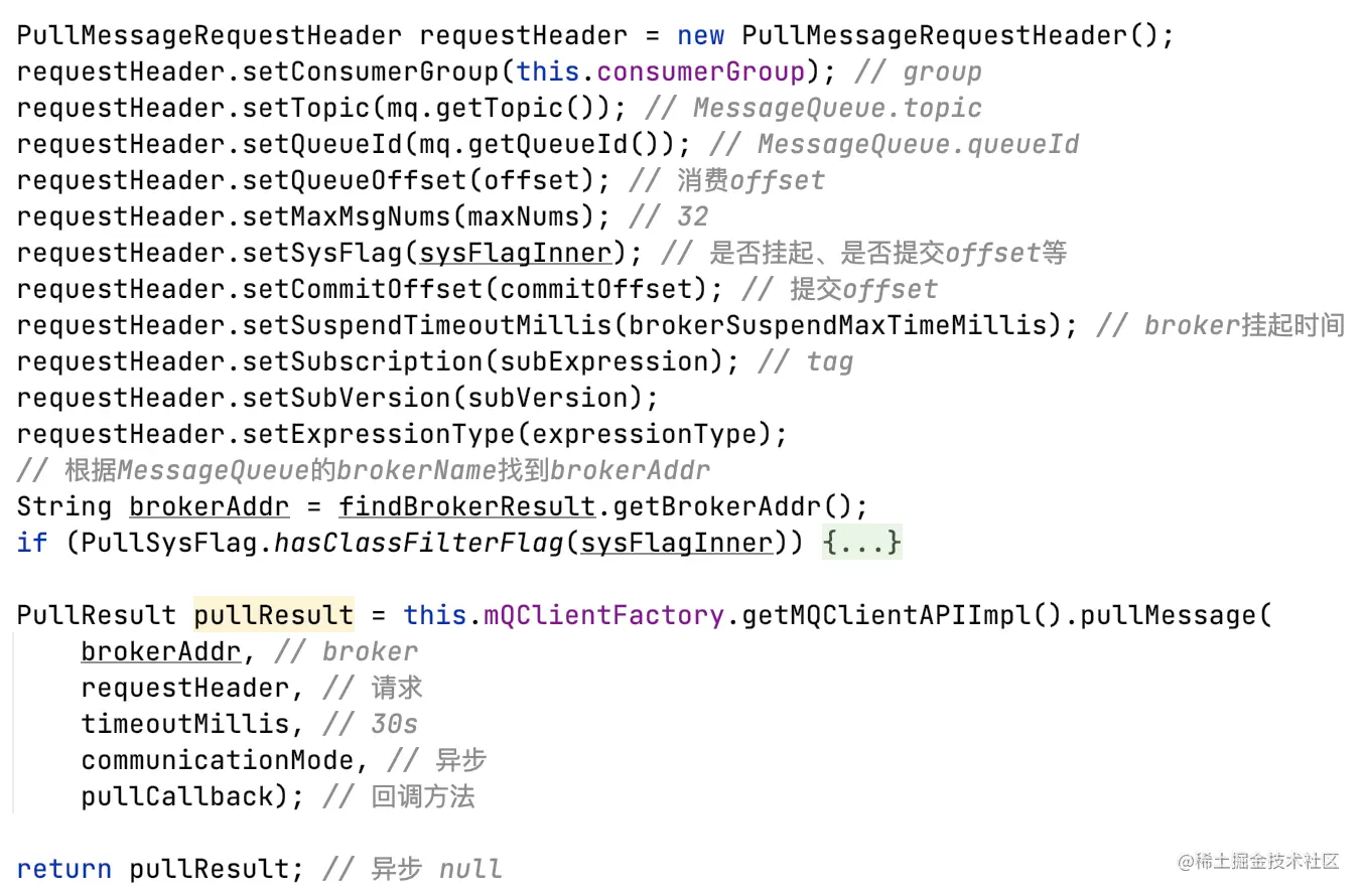 - PullRequest的拉取消息offset需要从broker获取(先根据group拿,如果拿不到有可能返回0,即queue的第一条消息开始消费),如果获取不到,走ConsumeFromWhere逻辑获取;