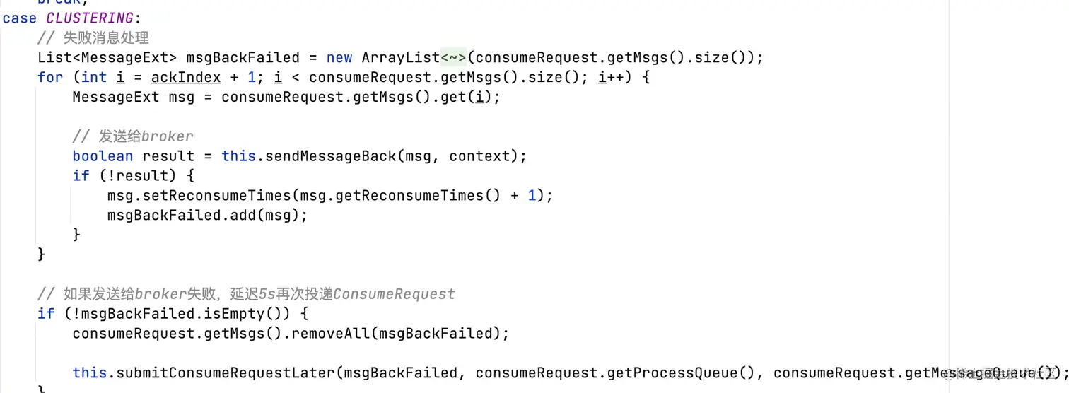 - 对于处理失败的消息,重新投递给broker,如果投递broker失败,延迟5s组装为ConsumeRequest提交到ConsumeMessageConcurrentlyService的线程池