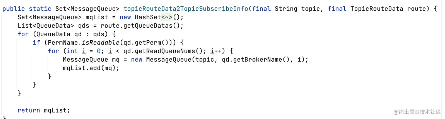对于消费者,将TopicRouteData中的QueueData按照可读队列数量转换为MessageQueue。