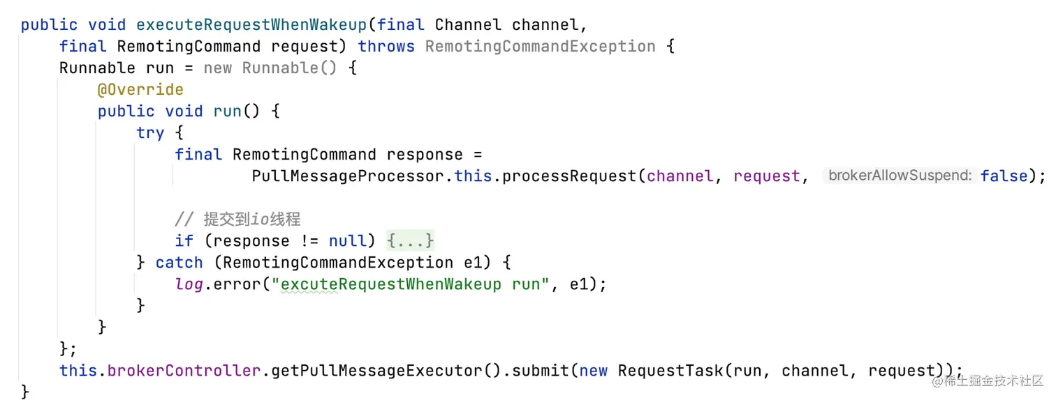 针对一个MessageQueue有一个PullRequest,由PullMessageService单线程处理,提交到io线程。