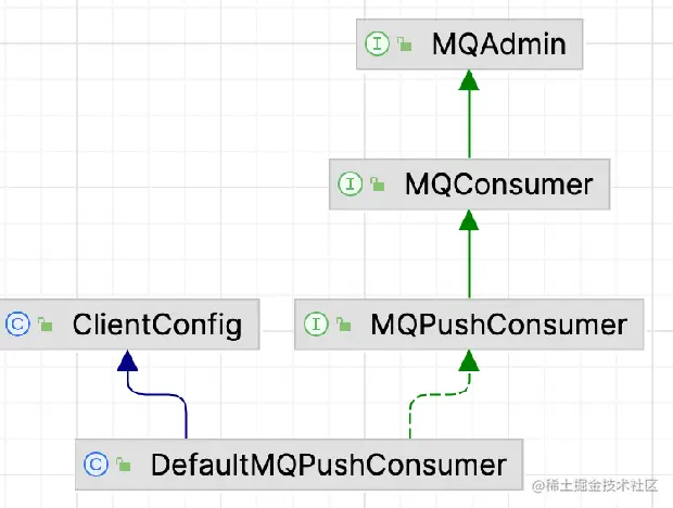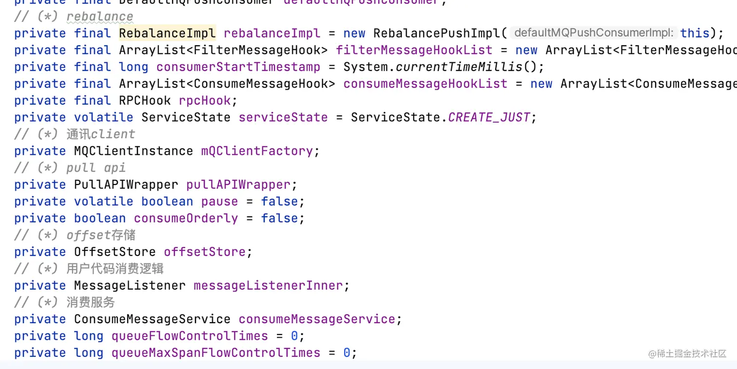 和DefaultMQProducer差不多,DefaultMQPushConsumer是暴露给用户的api。