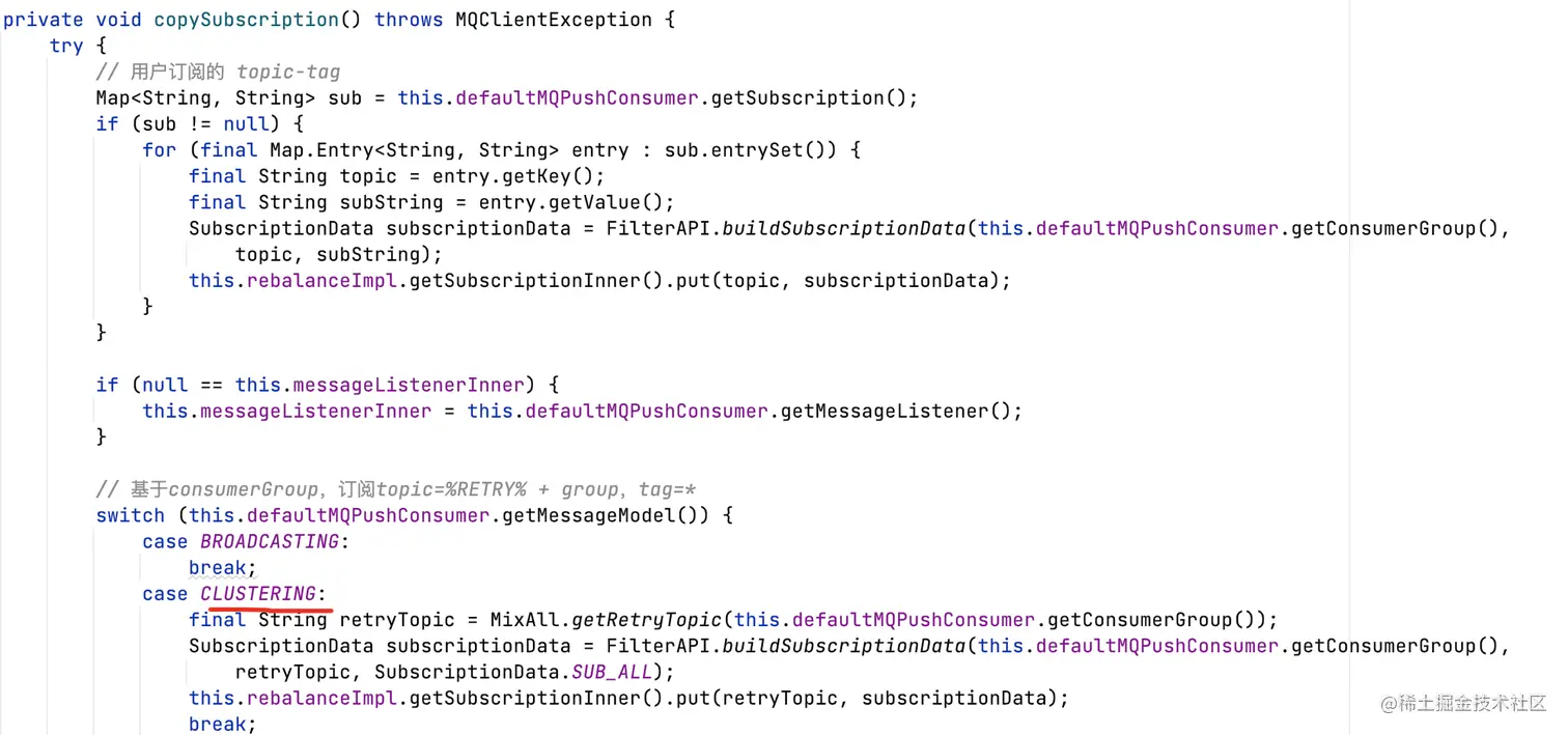 DefaultMQPushConsumerImpl#copySubscription: