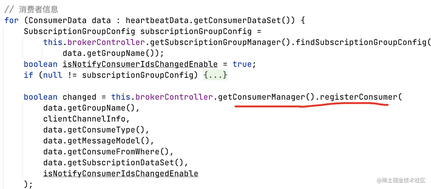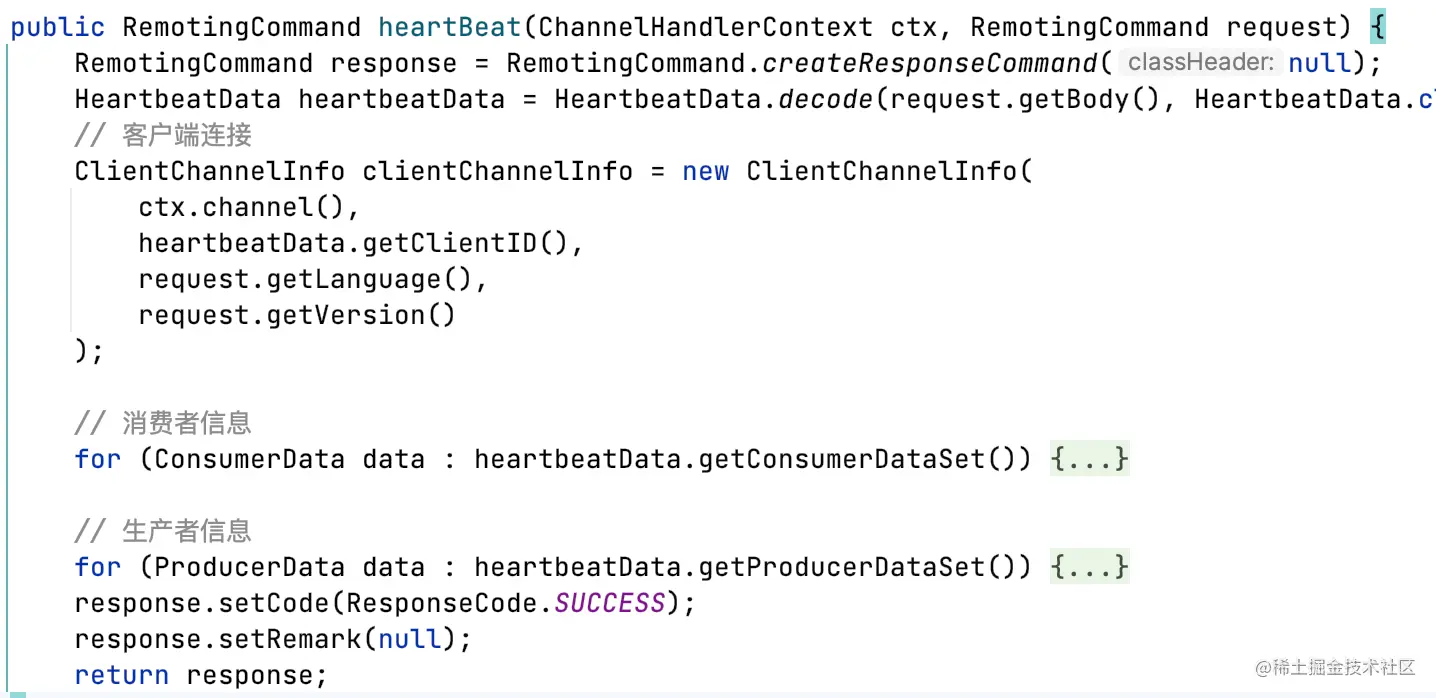 - 主动发送心跳,包含ConsumerData消费者信息和订阅信息;