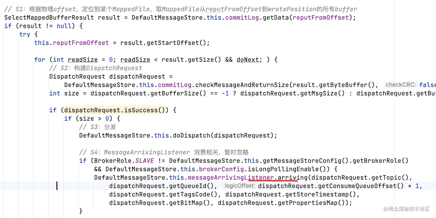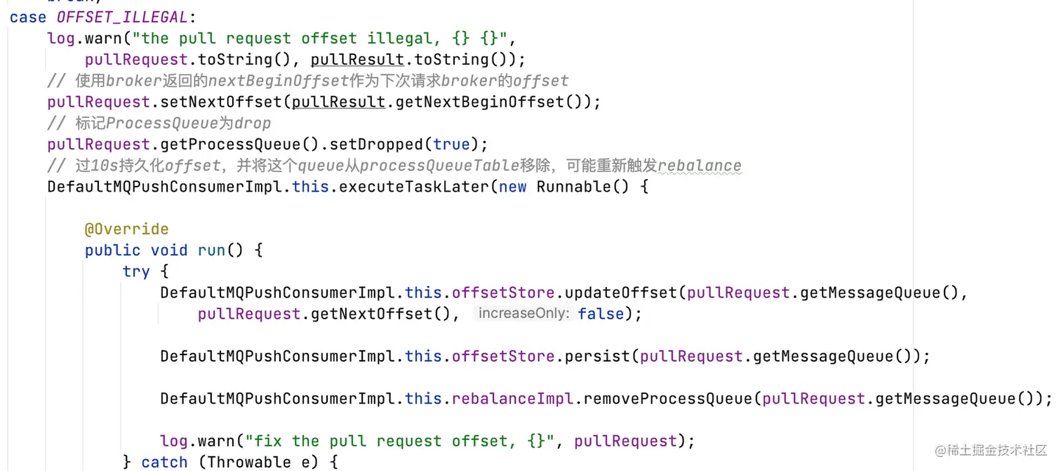 - OFFSET_ILLEGAL,请求逻辑offset超出consumequeue的逻辑offset范围,即非法offset,延迟10s移除对应ProcessQueue,可能触发rebalance;