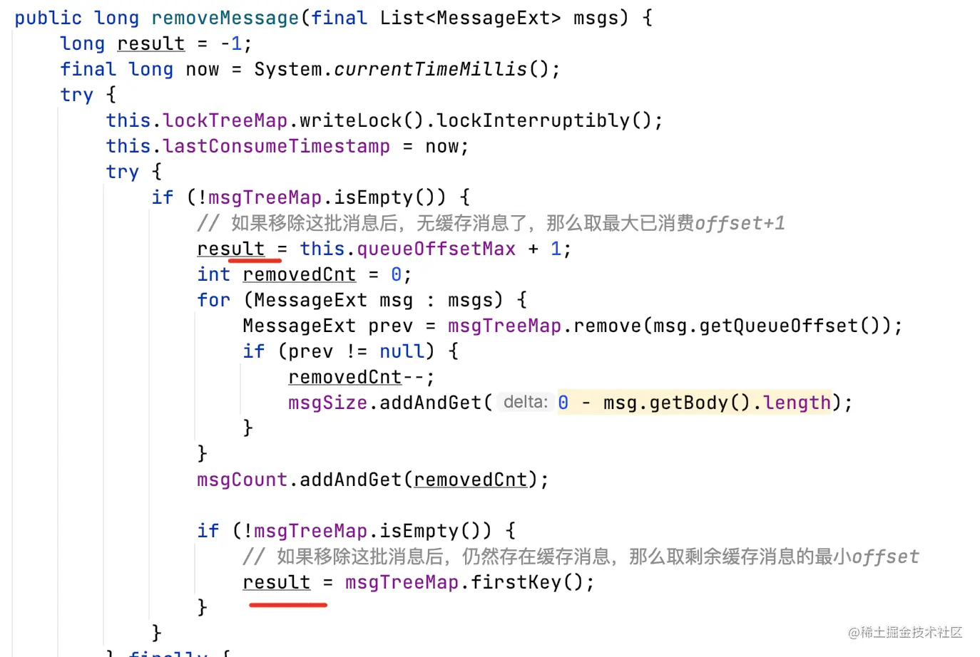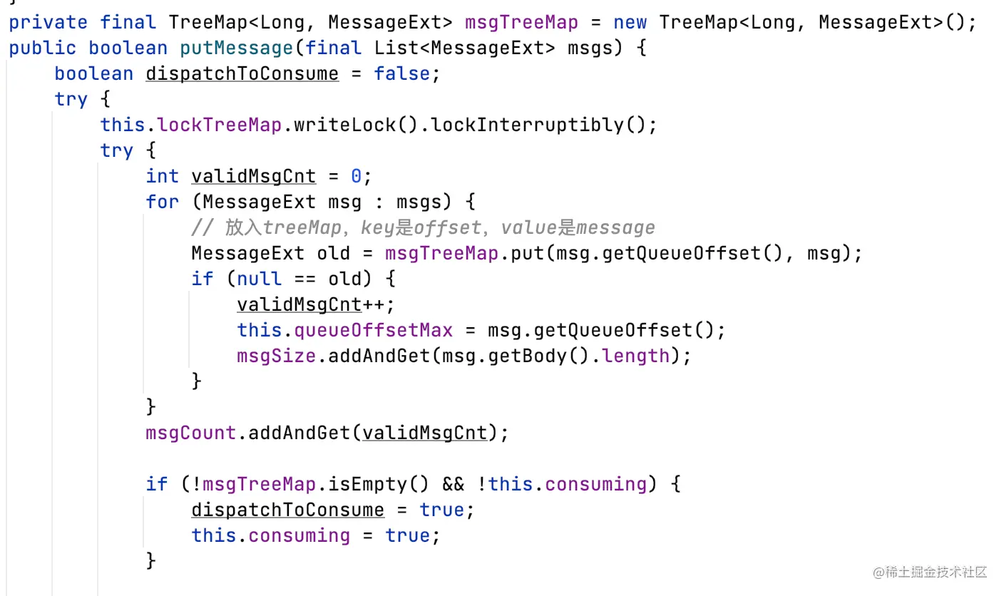 - 缓存消息到ProcessQueue中的TreeMap,key是逻辑offset,value是消息;