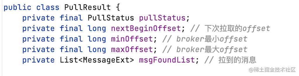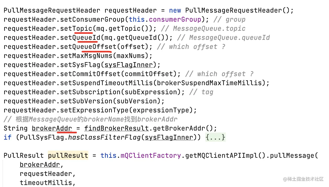 broker提供的的pull api,需要consumer提供多个必要参数来获取消息:如topic、queueId、brokerAddr。