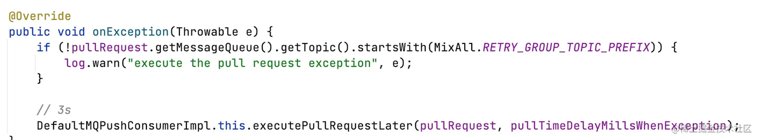 - 其他,都属于异常,延迟3s再次投递PullRequest到PullMessageService线程;