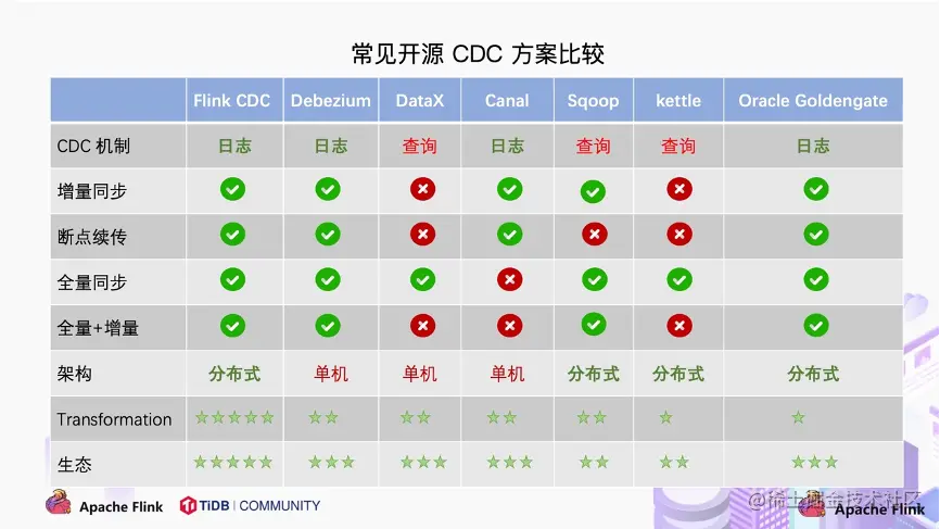 sqoop,kettle,datax之类的工具,属于前大数据时代的产物,地位类似于web领域的structs2。而且,它们基于查询而非binlog日志,其实不属于CDC。首先排除。