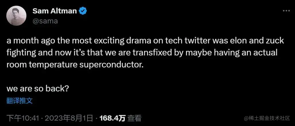 上个科技界热门话题 ChatGPT 的出品者 OpenAI,他们的 CEO 山姆・奥特曼也在说:现在我们因为可能拥有室温超导而兴奋,全都回来了?