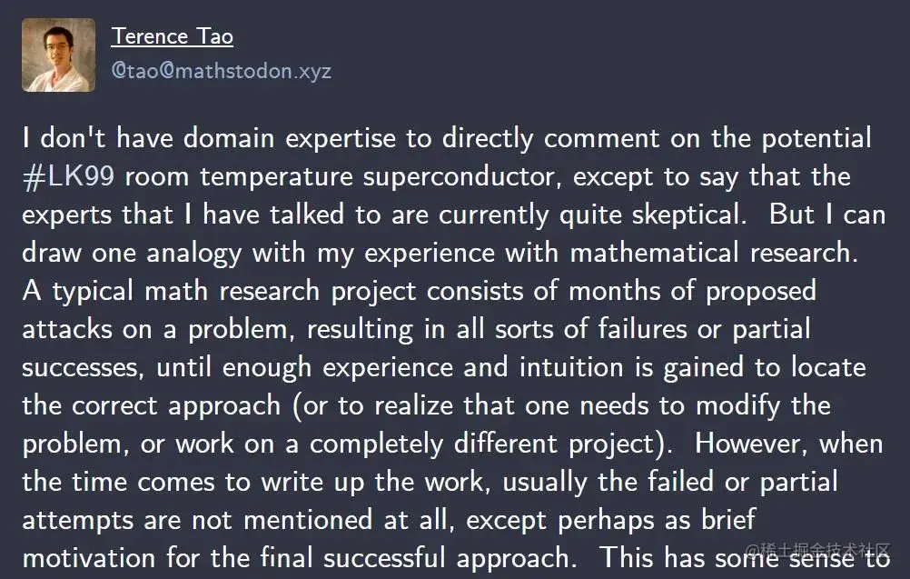 陶哲轩还表示自己看到关于 LK-99 报道称最初的公告发布得过早,而研究仍处于「充其量是部分成功」的阶段。因此,如果按照「成功的、已经完成的研究」标准来评判,这项研究确实表现很差。但作为「研究正在进行中,意外地向公众透露」的科研,陶哲轩倾向于宽容的态度,我们可以耐心地等待科学结果。