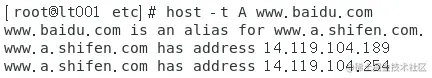 再开一终端,输入host -t A www.baidu.com,看结果: