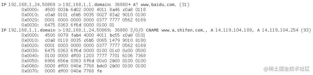 tcpdump开-x看看,输入tcpdump -i ens33 -ntx -s 500 port domain