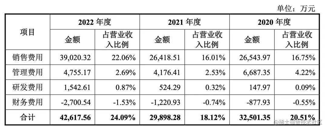 根据招股书,2020-2022年,敷尔佳研发投入分别为147.97万元、524.29万元及1542.61万元,占营业收入的比例分别为0.09%、0.32%及0.87%。形成明显对比的是,这三年敷尔佳的销售费用分别为2.65亿、2.64亿、3.90亿,销售费用率分别为16.75%、16.01%、22.06%。