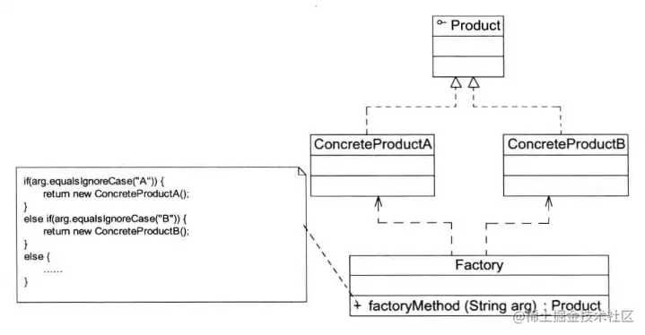 简单工厂模式的核心,负责实现所有实例创建的具体逻辑,创建方法可以被外界直接调用,并以父类Product返回