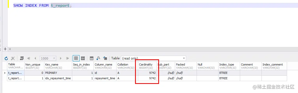 我们知道mysql在使用索引的时候,是会根据数据的分布进行的,也就是mysql会考虑索引的效果,如果效果好才使用。我们常说性别字段不适合建索引,就是因为这种字段的区分度很低,mysql宁愿全表扫描也不会使用这种索引。使用show index from table可以查看索引信息,cardinality就是字段的区分度,通常该值越大越适合建索引。