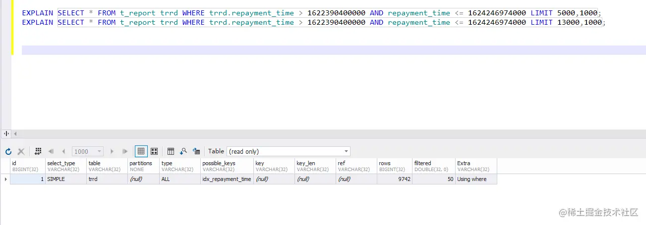 SELECT * FROM t_report WHERE repayment_time > 1622390400000 AND repayment_time <= 1624032000000 order by repayment_time,id limit 1000,1000