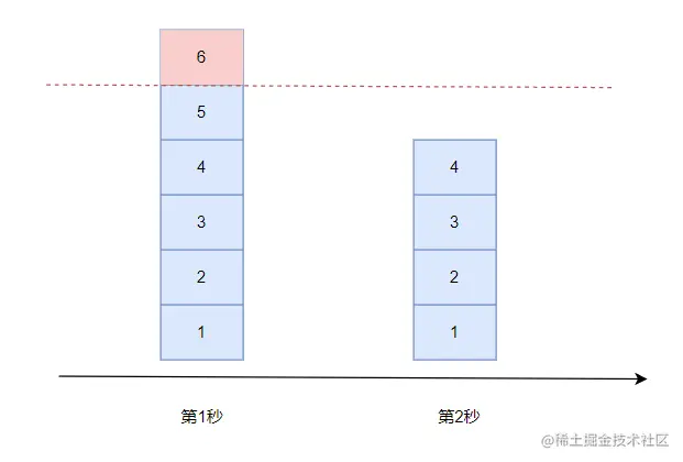 - 若当前窗口的区间计数器总和超过额定的限制数量8,别区间2使用了5,则区间3最多只能使用剩下3个,后续请求都被丢弃。