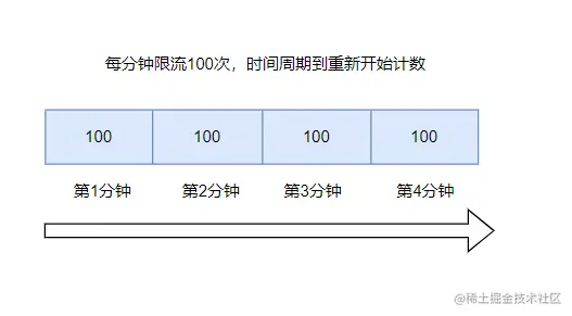 可能存在的问题是:请求分布的不均衡,比如在时间周期1分钟的第1秒,就把100次请求用完了,那么最后59秒都是空白的。也可能直到最后1秒才有大批量的流量