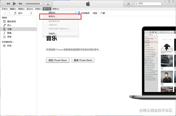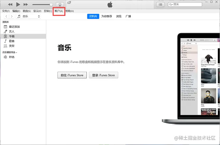 步骤1:首先用数据线连接电脑和手机,然后打开iTunes软件,点击左上角的【账户】选项。