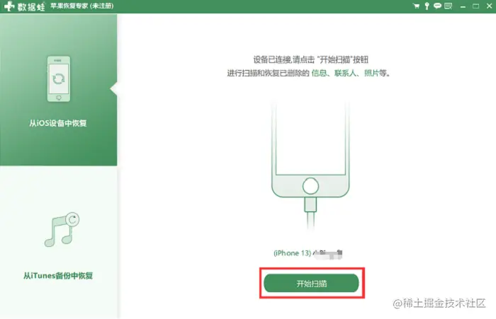 步骤2:启动软件,选择第一种方法【从iOS设备中恢复】,然后使用数据线将iPhone连接到计算机,解锁设备并获得设备端的信任,然后单击【开始扫描】按钮。