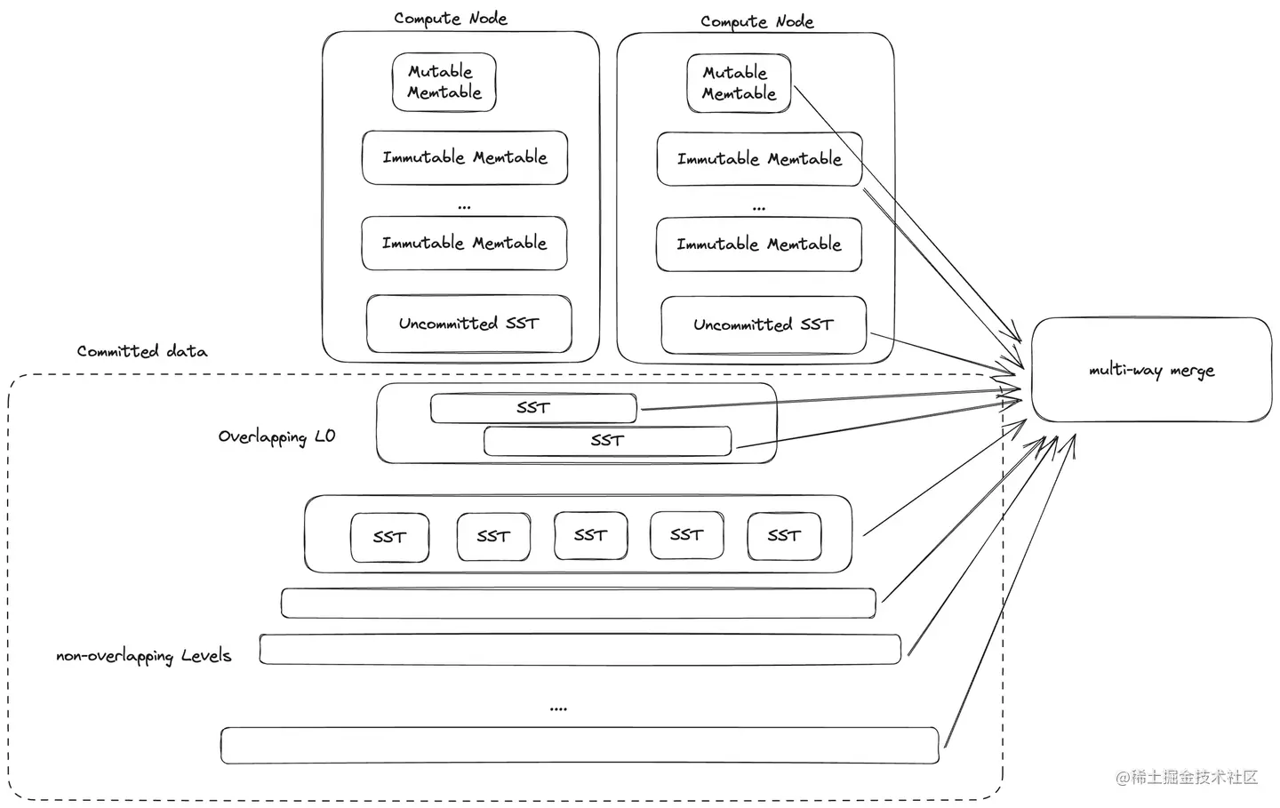 与一般的 LSM 存储引擎类似,新写入 Hummock 的数据将会写入 mutable mem-table 中,在特定条件下,mutable mem-table 会被 freeze 成 immutable mem-table。最终immutable mem-table 会写成 SST(sorted string table)文件落入持久化的存储中,同时SST会在 LSM 的元数据中被加到 overlapping L0 中。经过 compaction,overlapping L0中的数据会进入 non-overlapping 的 LSM 下层。