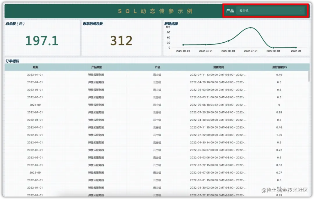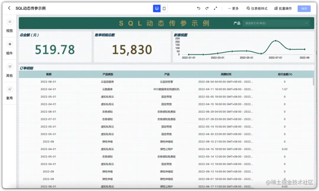 当我们在仪表板上使用账单数据时,预备将产品作为筛选条件,并且希望该条件在SQL数据集中作为动态参数被传入。