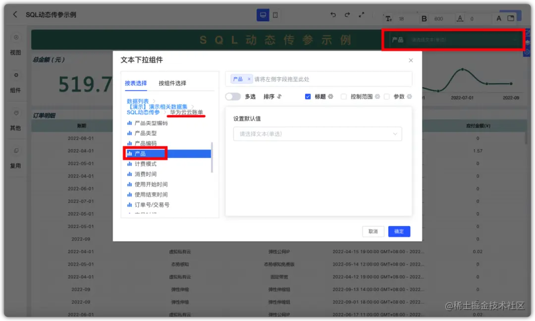 该仪表板中同时放置了一个文本下拉筛选组件,并将华为云云账单SQL数据集中的产品作为筛选条件。