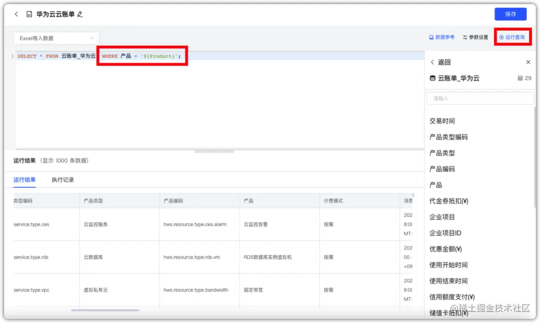 这部分我们通过一个示例来介绍。如下图所示,通过一个简单的SQL语句,我们查询了华为云的账单数据。