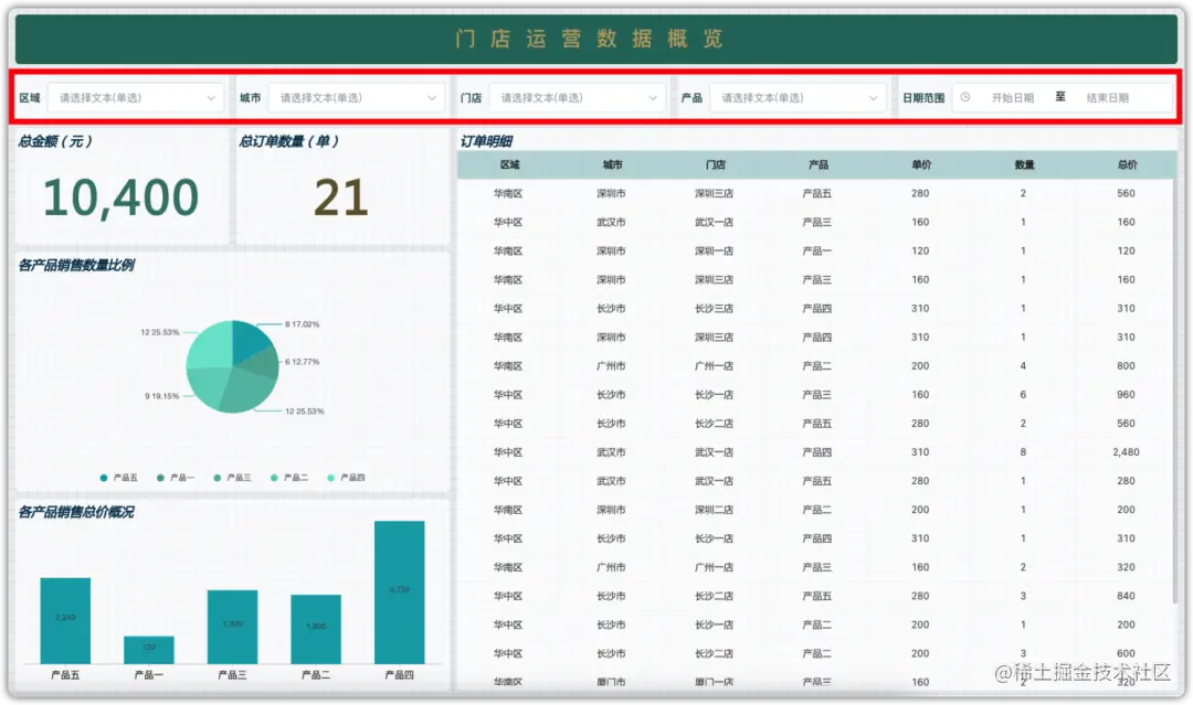 从筛选条件中任选一个数据值进行过滤,由于此时并未绑定SQL数据集的动态参数,即所选的值并未直接传到“Product”变量中,而是在其SQL外层拼接新的过滤条件。但其并不影响对仪表板数据的过滤,如下图所示,仪表板筛选结果与之前一致。