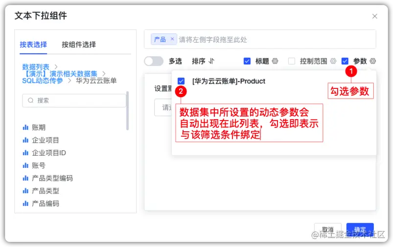 将该组件与SQL数据集中预设置的参数进行关联,如下图所示,勾选对应参数即可。
