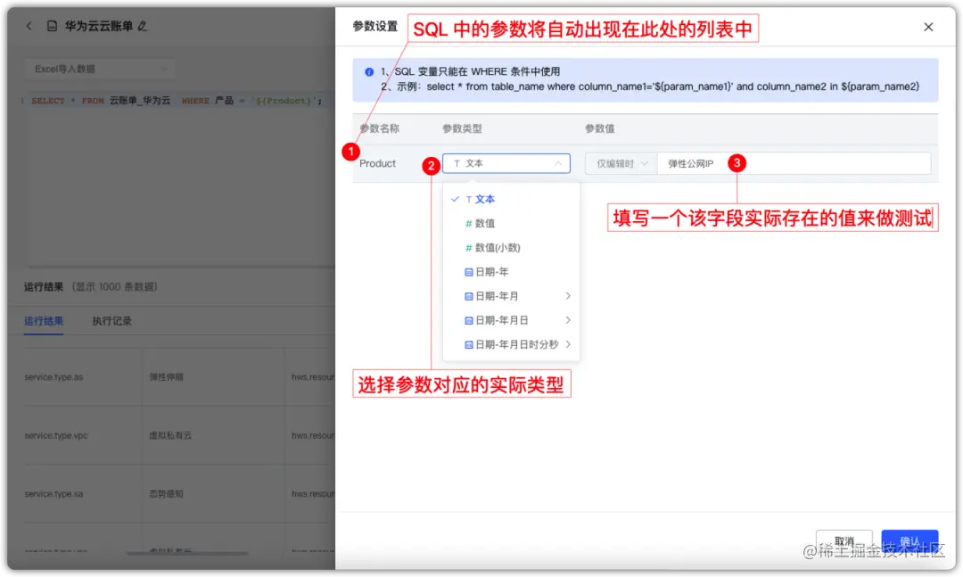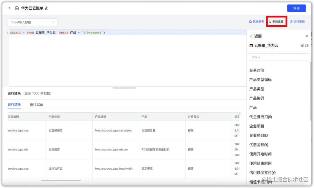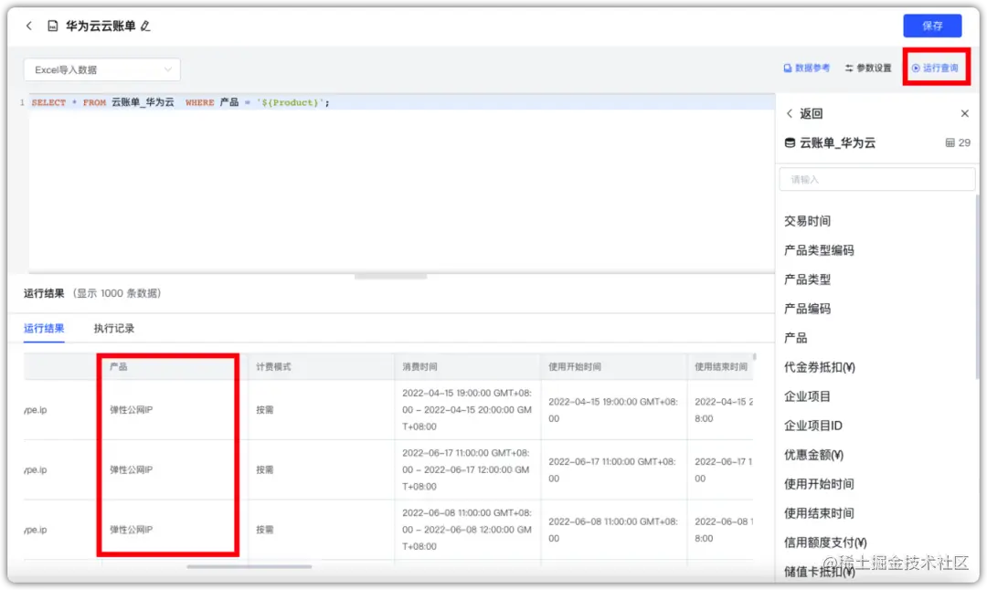 再次点击SQL数据集编辑界面右上角的“运行查询”按钮,观察运行结果。如下图所示,此次查询结果均为已设置的产品类型为“弹性公网IP”的数据,由此证明动态参数是正常生效的。