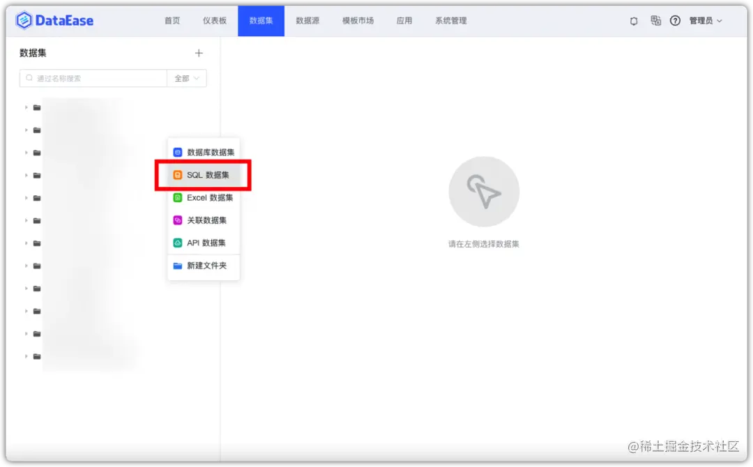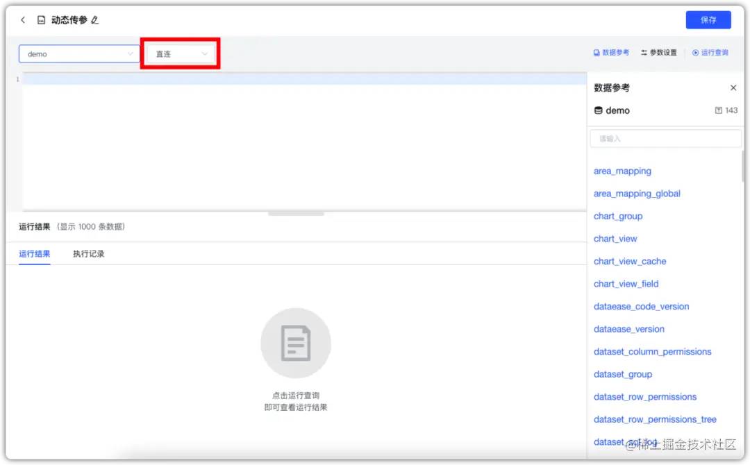 进入SQL数据集编辑界面后,数据链接选择使用直连模式(直连与定时同步的差异参见:dataease.io/docs/user_m… )。