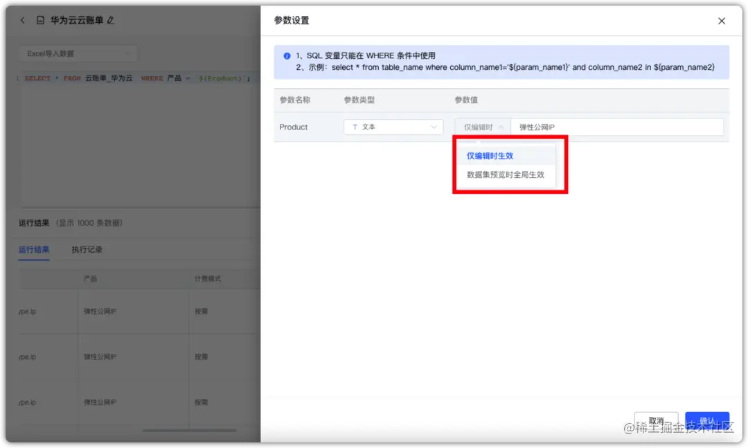 ■ 仅编辑时生效:参数设置中所赋予的值仅用于在此数据集的编辑界面中的“运行查询”测试,离开数据集编辑界面后,该值无任何作用;