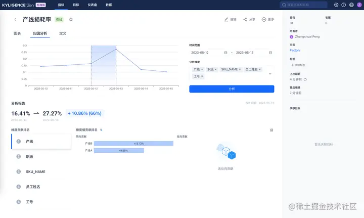 数据分析门槛高?点击一键归因,帮你直接获取归因结果,定位原因。某天产线损耗率急剧波动上升怎么回事?一键分析,快速获取该指标波动背后的归因报告,了解该业务指标变化的各项因素的占比,比如该例中到底是哪条产品的生产线出问题,或是哪个操作工损耗最多?帮助生产车间主任快速针对性地解决问题。